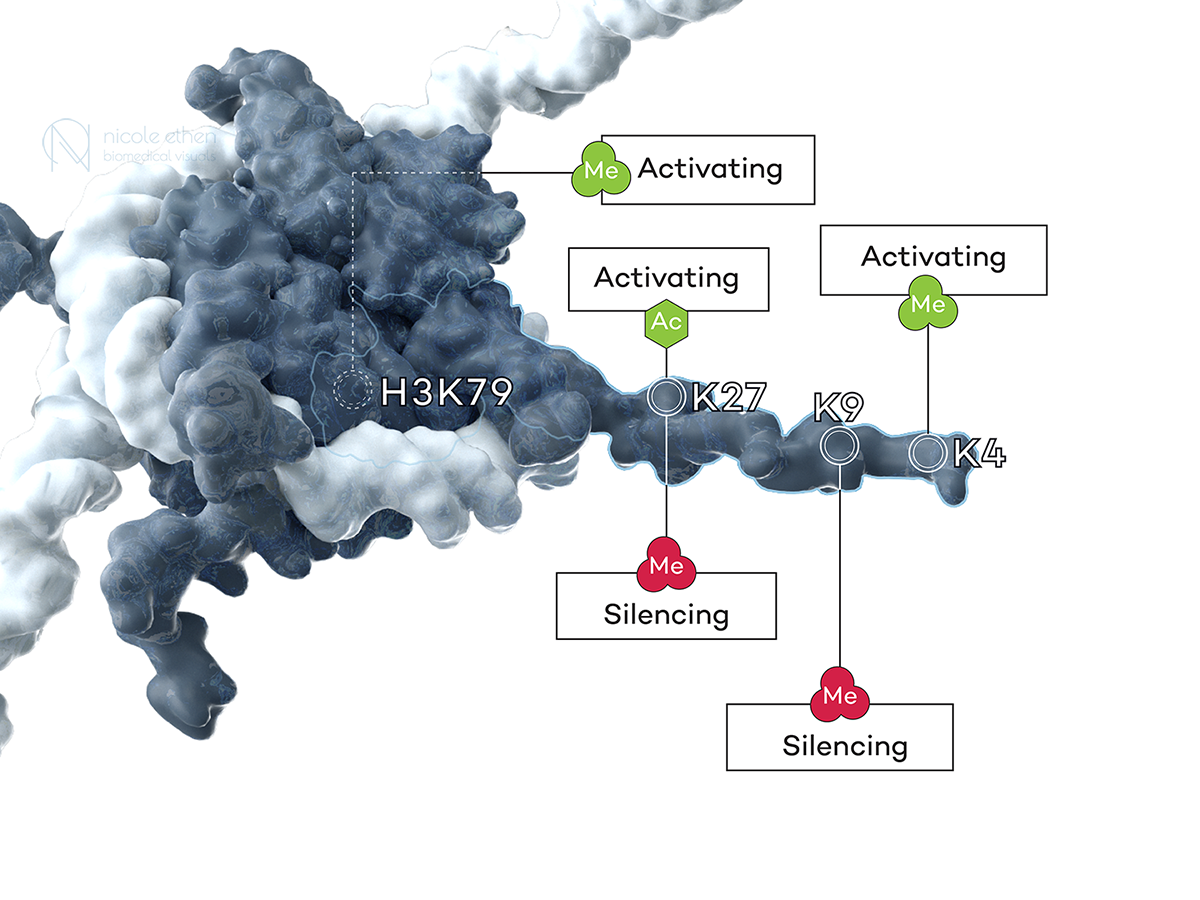 An image for a presentation slide, this blend of 2D and 3D was intended to showcase the differing effects on transcription of adding a methyl or acetyl group to histone H3.