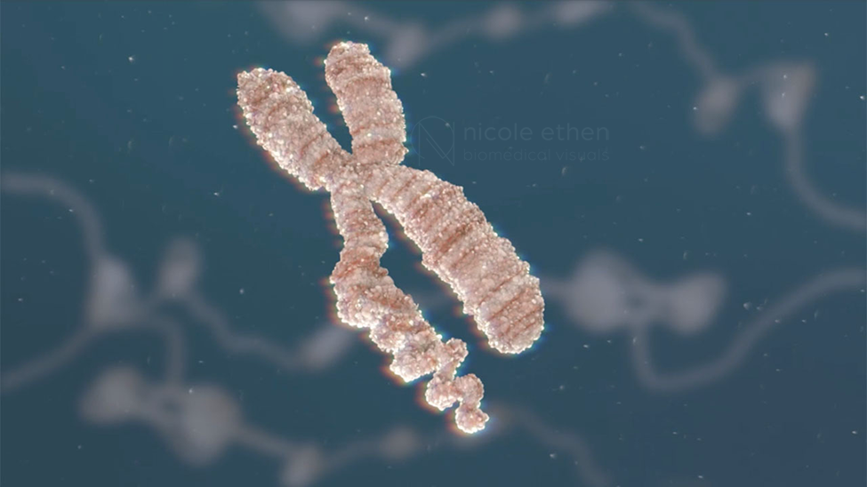 Image showing progression from chromosome -> DNA -> mRNA -> protein for use as presentation material.